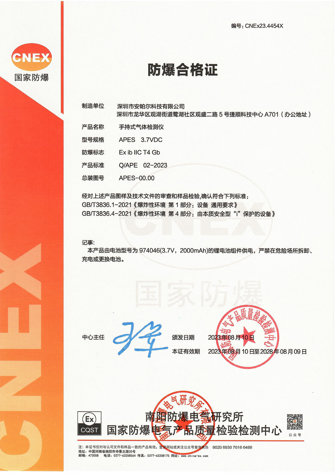 APES 3.7VDC 防爆合格證